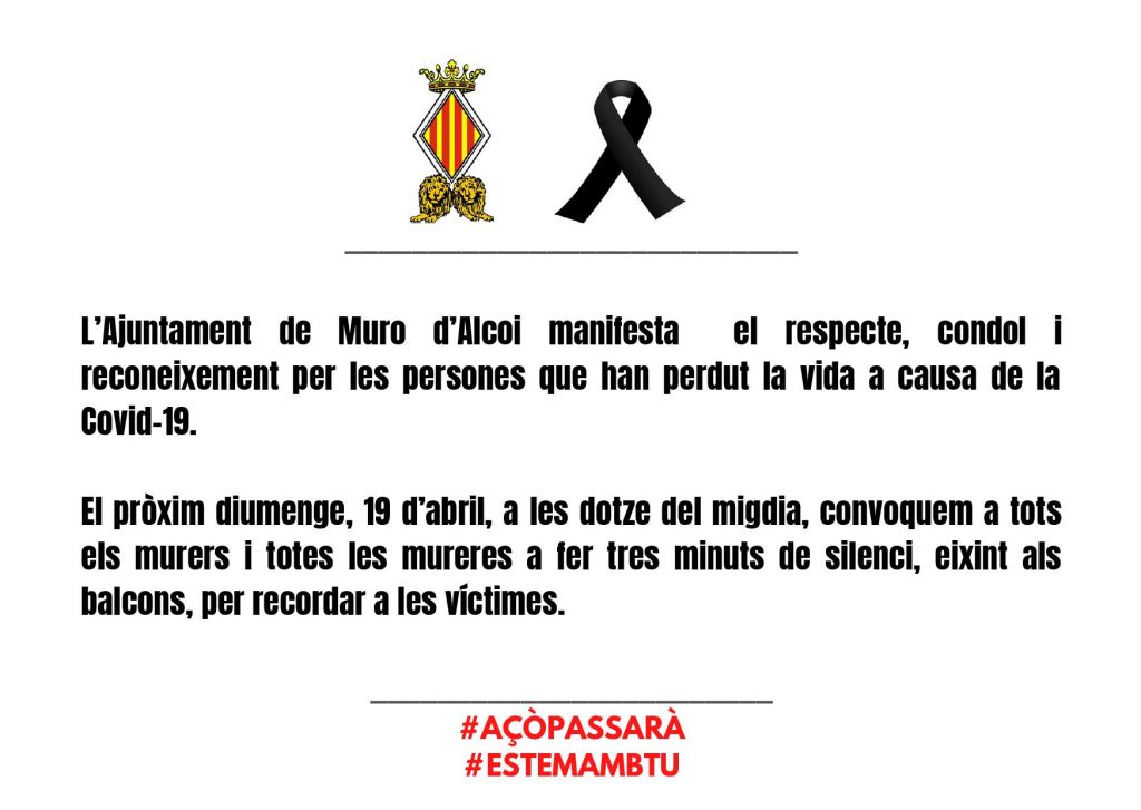 Com a mostra de respecte, condol i reconeixement per les persones que han perdut la vida a causa de la Covid-19, l’esmentat dia les banderes oficials onejaran a mitja asta a l’exterior de l’edifici municipal del nostre Ajuntament.
